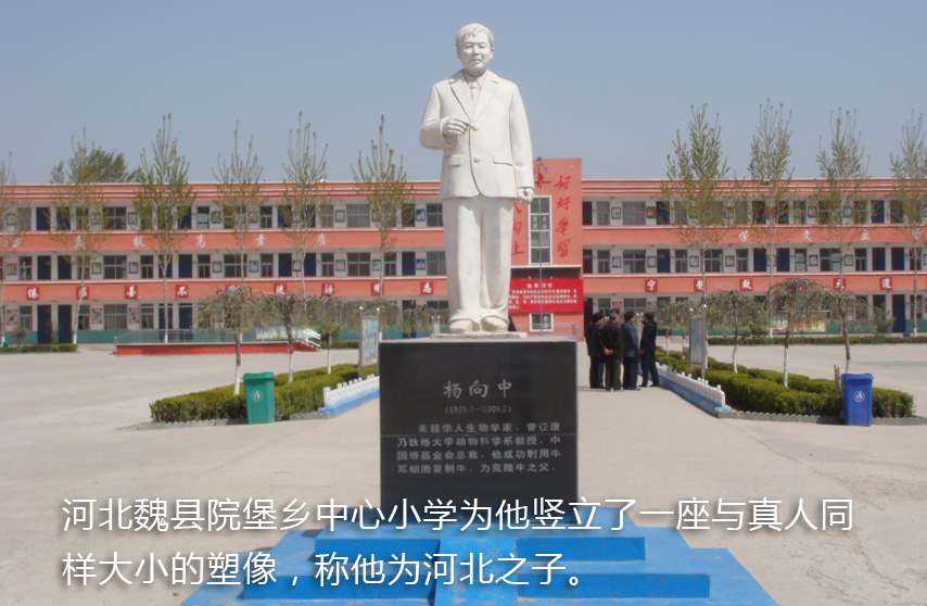 在與病魔進行了長達12年的斗爭后,楊向中于2009年2月5日在美國波士頓病逝,享年49歲。他因克隆大型動物被《吉尼斯世界紀錄》收錄,他的科研人生壯麗輝煌,他的名字被載入《世界名人錄》。