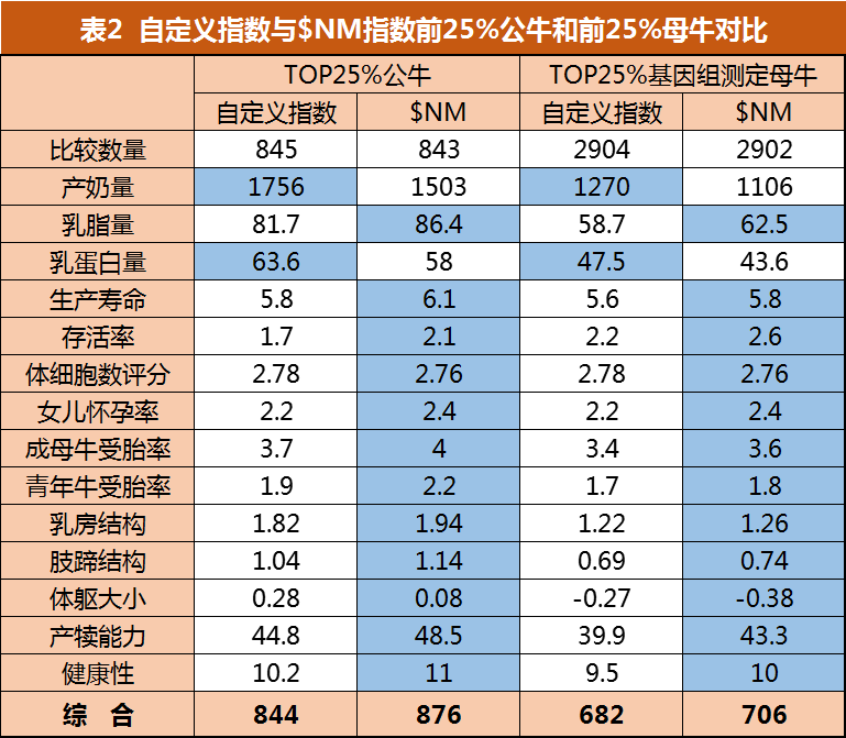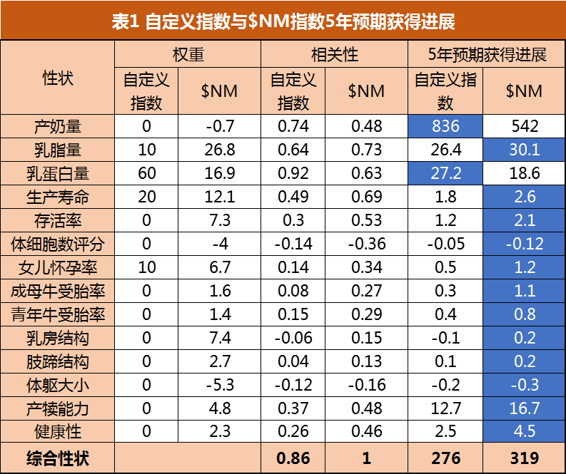 表1顯示了自定義指數($Cust)和$NM指數各個性狀的權重、相關性和預期遺傳進展的比較,藍色部分為各個性狀在5年后獲得遺傳進展的優勢。